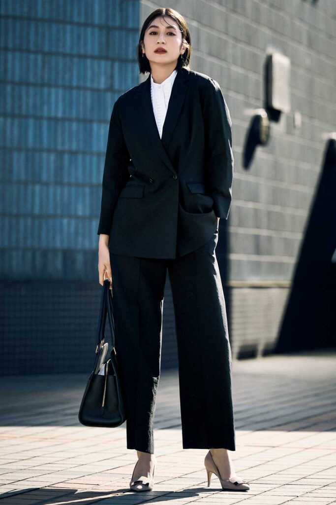 さりげなく胸元にデザインの効いたブラウスを投入して、黒スーツのリクルート感を回避。ジャケット¥16,900パンツ¥9,900[ともに3月中旬発売予定](ともにWHITE/SUIT SQUARE TOKYO GINZA店)ブラウス¥35,200(ユナイテッドアローズ/ユナイテッドアローズ 丸の内店)バッグ¥286,000(J&M デヴィッドソン/J&M デヴィッドソン カスタマーサービス)パンプス¥130, 900(セルジオ ロッシ/セルジオ ロッシ カスタマーセンター)ピアス¥99,000(マリハ)