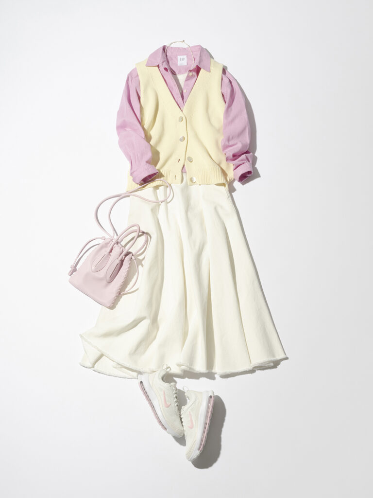 ピンク×イエロー×白で作る、春の好印象コーデ