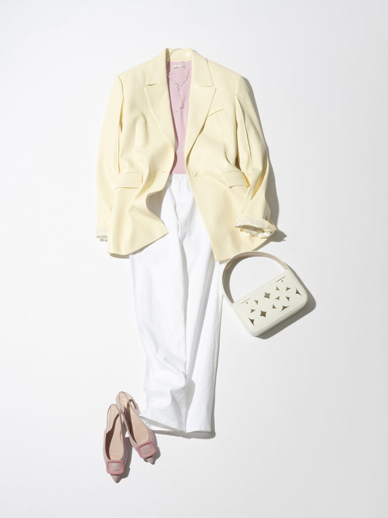 「ピンクとイエローのハッピーな色合わせが春らしい、ガンバレルーヤ配色。どちらもトレンドカラーなので、ぜひ今シーズン挑戦して欲しい着こなしです。イエローとピンクのトーンを揃えると、カラーONカラーでも奇抜にならず大人に。上半身で色を重ねてボトムスは白、のバランスもキレイ見えの秘訣です」