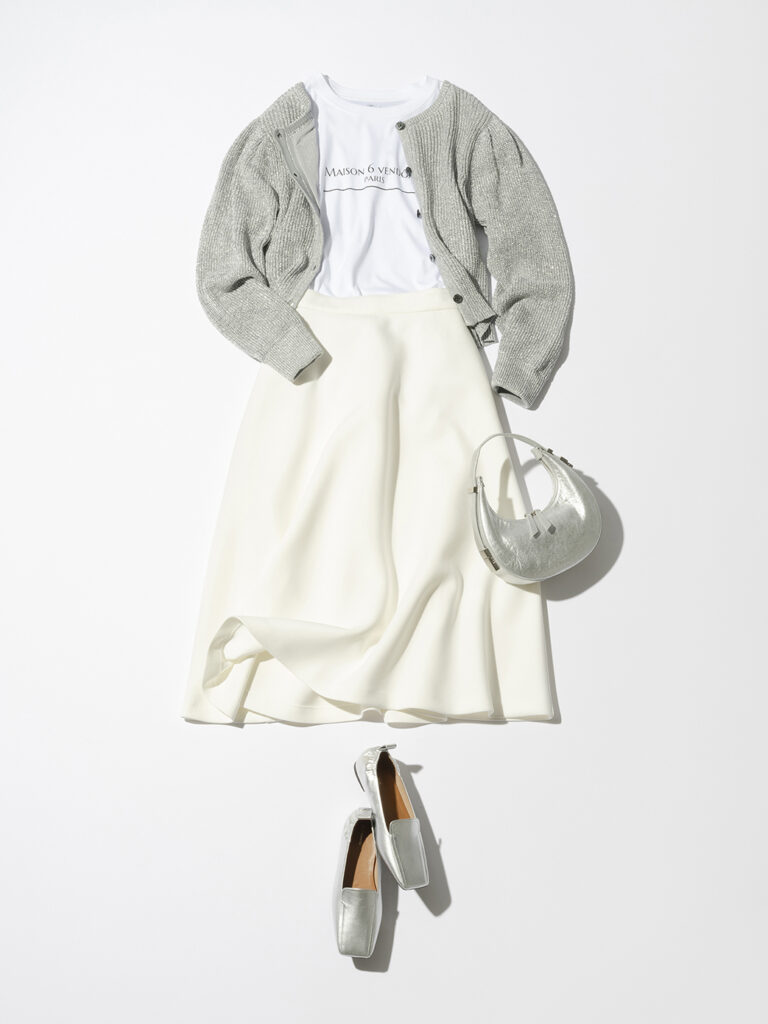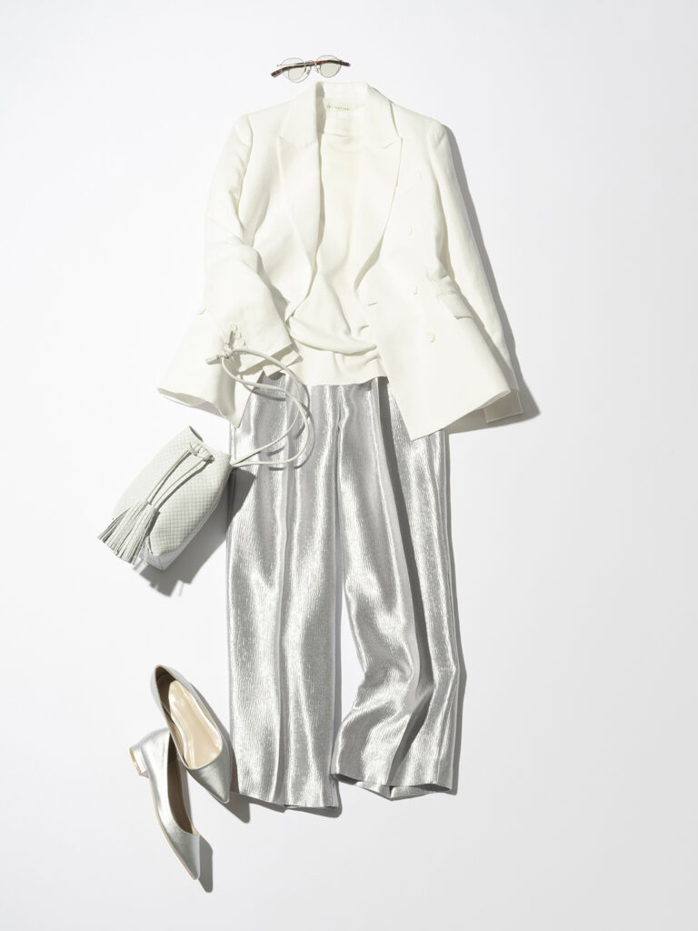 「メタリックやラメといった、2024春のトレンドが盛り込まれたゆってぃ配色。光沢を散りばめることでシンプルな着こなしも女らしくシフト。新顔のシャイニー素材は、グレー感覚で取り入れればコーデは簡単。シルバー×白でまとめたカラーリングで洗練度も高まります」