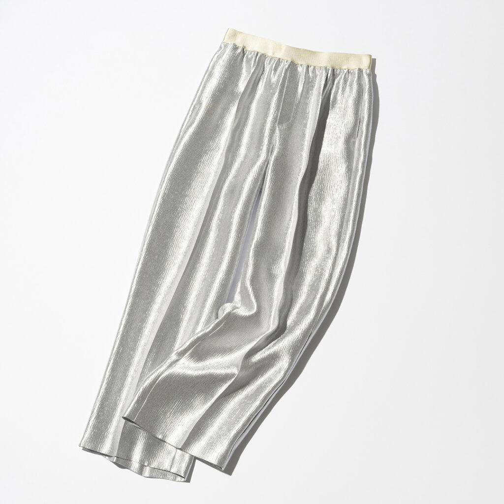 グレーのワイドパンツ感覚でスタイリングしやすいキレイめシルエット。シャープなツヤめきがパンツスタイルをさらにハンサムに。センタープレス入りでIラインを強調できるから、スニーカーでもバランスが取りやすい1本。シルバーメタリックパンツ¥26,400(アストラット/アストラット 新宿店)