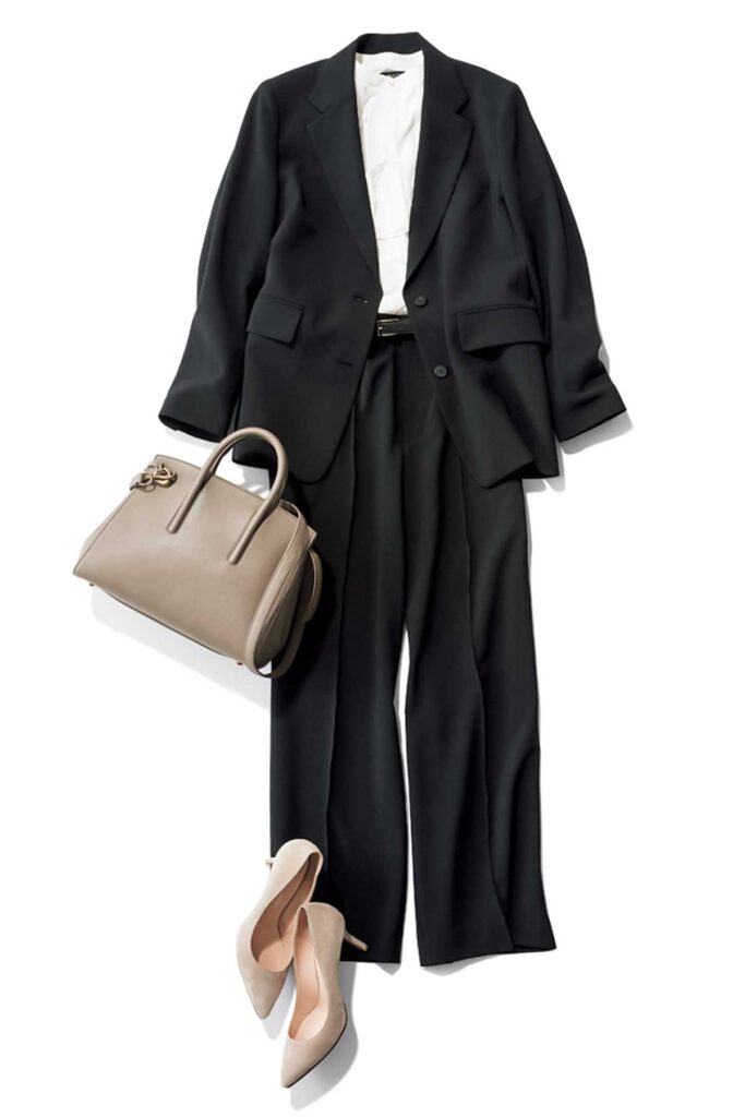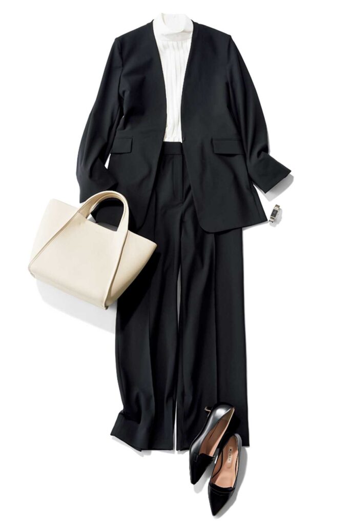 かっちり度高めのブラックスーツにクリーンな白のインナーで清潔感をプラス