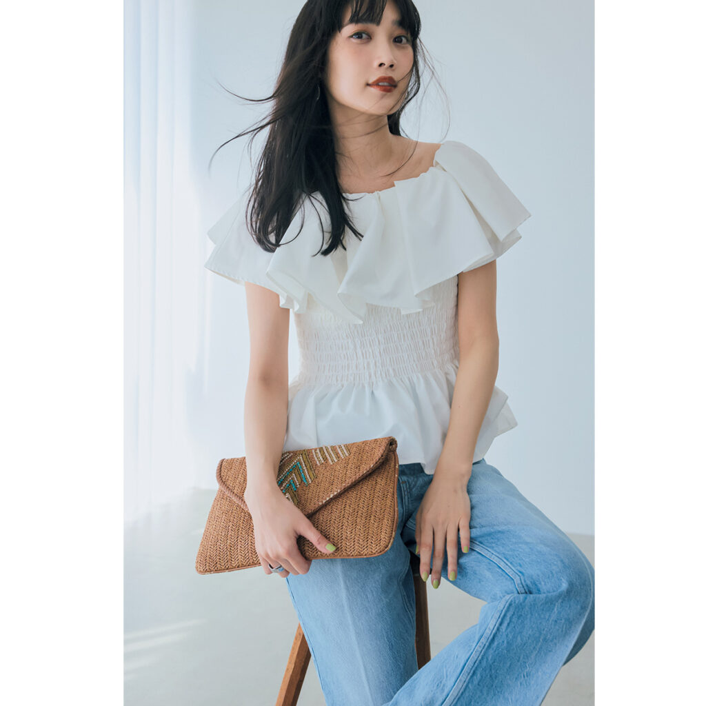 [WHITE]全体的にふんわりとボリュームがあったこれまでのフェミニントップスに代わり、今シーズンはほどよく女らしいラインを引き立てるデザインがトレンドに。細見え効果の高いシルエットにこだわって設計しているので、スタイルが気になる大人の女性も素敵に着こなせます。フリルカラーブラウス¥14,300(スリースクエア)デニムパンツ¥28,600(レッドカード トーキョー/ゲストリスト)イヤリング¥7,700バッグ¥54,000(ともにアビステ)リング¥33,000(ウノアエ レシルバーコレクション/ウノアエレ ジャパン)