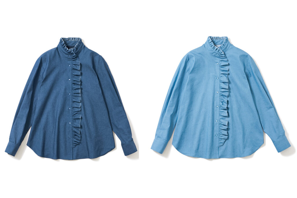 『普通の甘いブラウスに飽きてきたので、今季注目のデニム素材でひと味違う見た目にアップデート。上にスウェットやニットを重ねて、衿をちらっと見せる着こなしも可愛くておすすめです。』