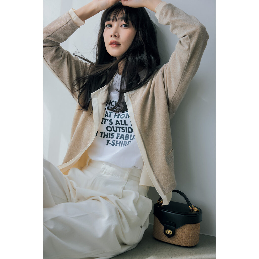 [GOLD]通勤にもOKな控えめなキラキラ感で、シーンレスに着られる便利な春カーデ。ちょっぴりカジュアル感をプラスすることでラメカーデのコンサバ感をオシャレに払拭。ラメカーディガン¥16,500(スリースクエア)Tシャツ¥13,200(エルデール × シップス プライマリー ネイビー レーベル/シップス インフォメーションセンター)パンツ¥21,890(uncrave WHITE/アンクレイヴ) バッグ¥25,300(クリスチャン ヴィラ × デミルクス ビームス /デミルクス ビームス 新宿)