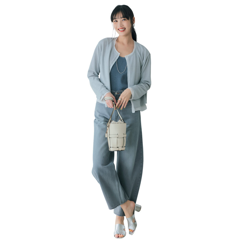 [SILVER]グレーで揃えたシンプルなデニムスタイルに、同じトーンのシルバーラメがキレイになじみます。さりげなく光る素材をMIXすることでコーデに奥行きが生まれ、洒落感も急上昇。ラメカーディガン¥16,500(スリースクエア)パンツ¥28,600(アンド アールシー/カレンソロジー 新宿)ネックレス¥51,700(マリハ)ピアス¥7,700(アビステ)リング¥22,220(バルブス/ZUTTOHOLIC)サンダル¥57,200(テラ/ティースクエア プレスルーム)バッグ¥46,200(オルセット/オルサ)タンクトップ/スタイリスト私物