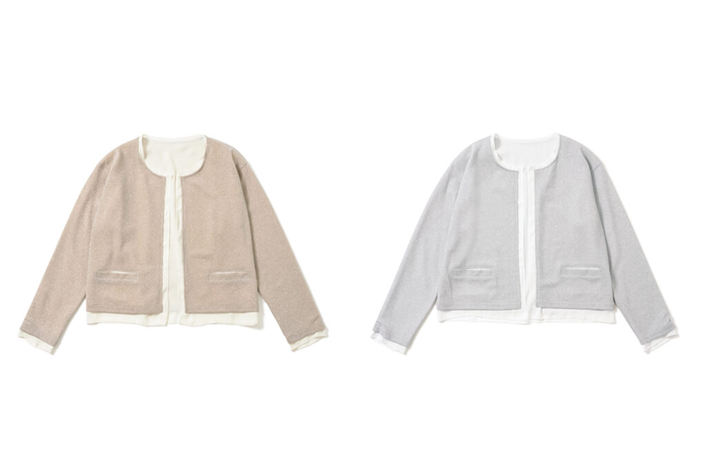 『羽織りものが必要な春先、ちょっとリッチでオシャレ感があるものを、と考えトレンドのラメ素材を採用。ギラギラしすぎない薄手の素材を選び、ひらっと揺れる裏地を付けて軽やかな着心地に仕上げています。』