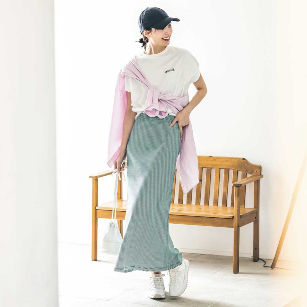 スカート¥6,050(ロバート ピー ミラー/買えるCLASSY.)Tシャツ¥8,800(アメリカーナ×ジーンズ ファクト リー/ジーンズ ファクトリー 卸団地本店)シャツ¥26,400(ティッカ)キャップ¥4,400(ニューエラ)バッグ¥19,800(ダブルスタンダードクロージング/フィルム)スニーカー¥14,850(アスファルト/アースマーケティング)