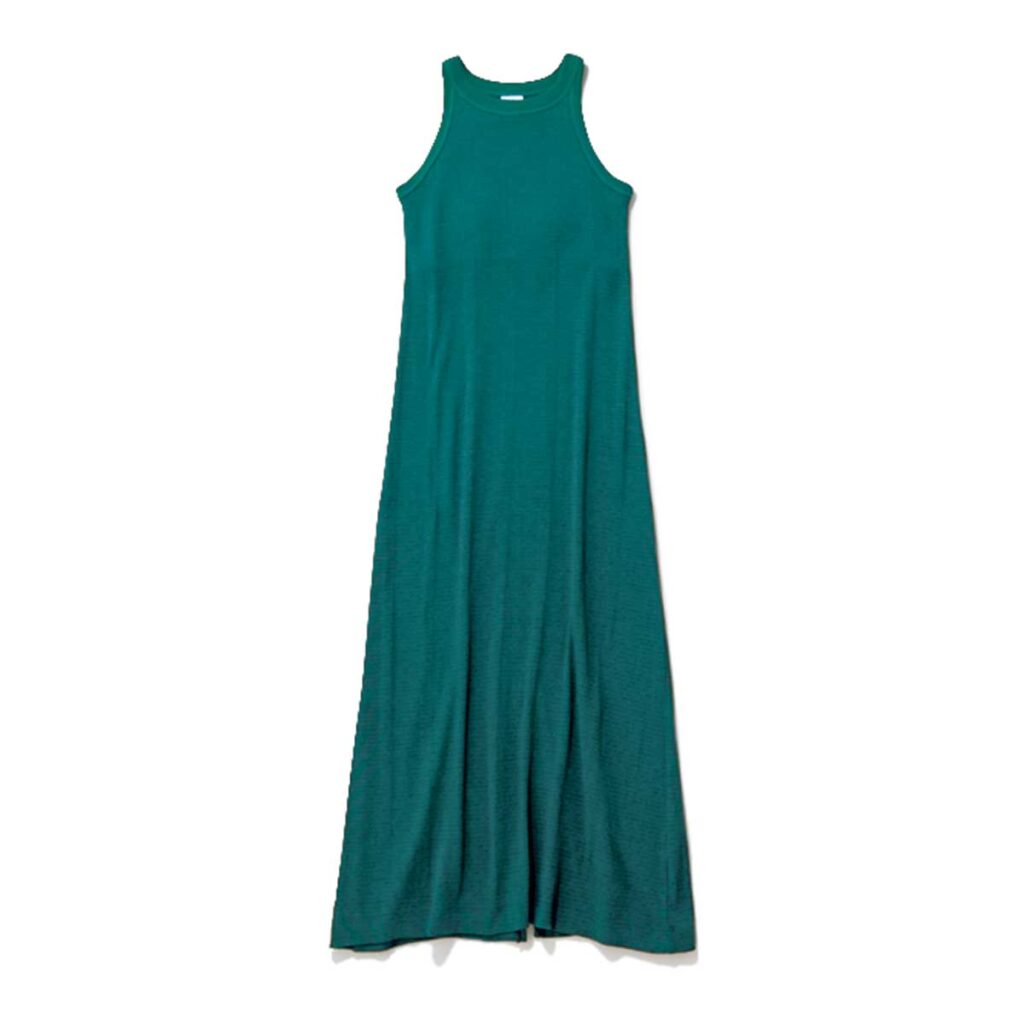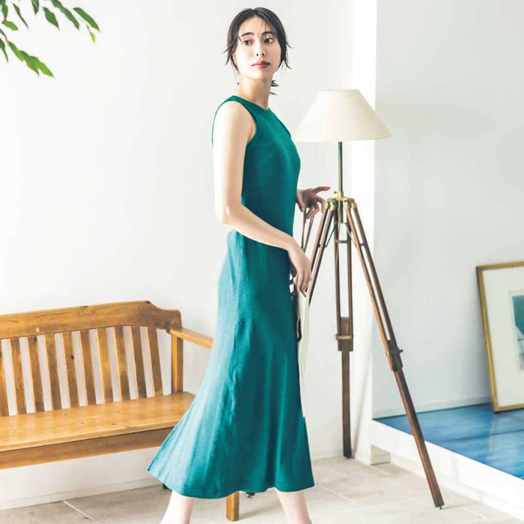 肩まわりを華奢に見せてくれるアメリカンスリーブ。太ももから裾にかけてふんわりと広がるシルエットで、歩くたびに美しい揺れ感を演出できます。バックスリット入りだから足さばきも◎。