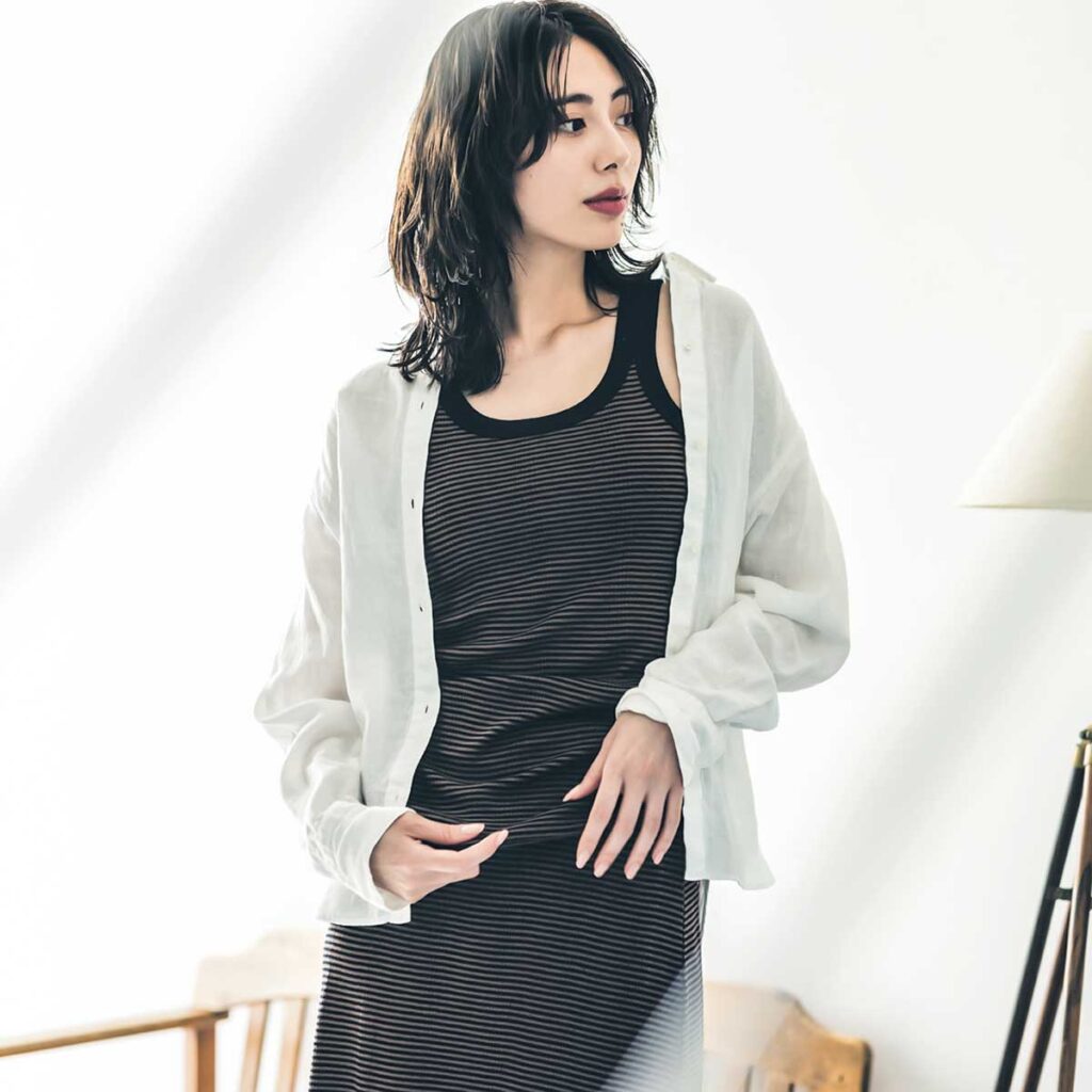 お部屋コーデに最適なカップ付きタンクトップは、シャツを羽織れば外着にも。ワンマイルウェアとしてもおすすめです。タンクトップ¥4,950スカート¥5,500(ともにロバート ピー ミラー/買えるCLASSY.)シャツ¥23,100(マイカ アンド ディール/マイカ アンド ディール 恵比寿店)