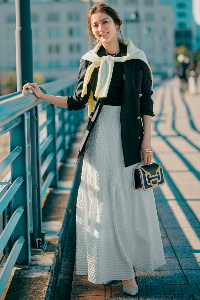 カーディガン・バッグ・靴の3点に春らしいパステルカラーを効かせて。優しげトーンの差し色なら、ベーシックとも相性よく、悪目立ちしない華やかさで好感度もばっちりです。ジャケット¥108,900(マディソンブルー)肩に掛けたニット¥36,300(エブール フォー ロンハーマン/ロンハーマン)Tシャツ¥9,680(カオス/カオス丸の内)スカート¥41,800(ソブ/フィルム)バッグ¥143,000(ピエール アルディ/ピエール アルディ 東京)パンプス¥57,200(ネブローニ)ピアス¥16,060(バルブス/ZUTTOHOLIC)ネックレス¥31,900(マリハ)バングル¥77,000(リューク)
