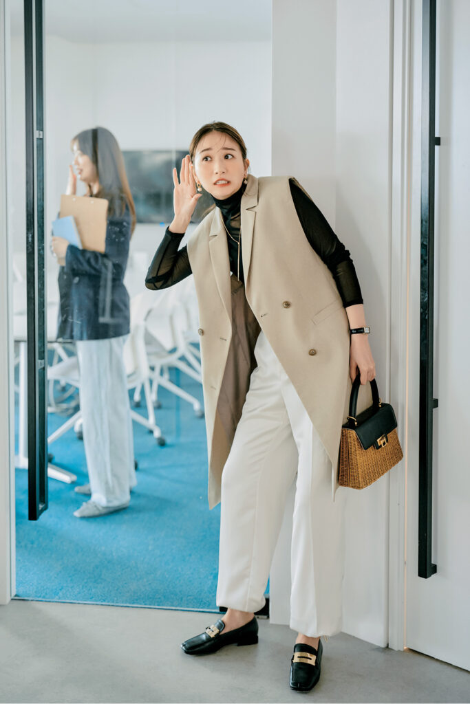 シアートップス着回し パラシュートパンツ¥19,800(ジャスグリッティー/ジャスグリッティー プレスルーム)ロングジレ¥35,200(ルーニィ)バッグ¥94,600(カパフ/エッセンス オブ アナイ)ローファー¥79,200(ペリーコ/アマン)イヤリング¥8,800(アビステ)ネックレス¥73,700(ココシュニック)時計¥19,800(カンポ マルツィオ/クラスフォーティーン)