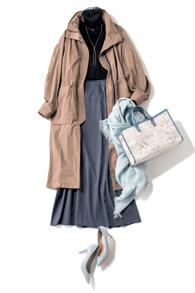 シアートップス着回し ナロースカート¥20,900(エーケー ワン/ビームス ハウス 丸の内)薄軽ブルゾン¥61,600(カオス/カオス丸の内)バッグ¥58,300(ア ヴァケーション)パンプス¥57,200(ネブローニ)ストール¥29,700(アソース メレ/アルアバイル)ネックレス¥73,700(ココシュニック)