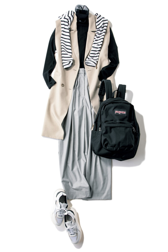 シアートップス着回し 背中開きボーダーT¥9,900(ルージュ・ヴィフ アンナ/ルージュ・ヴィフ ラクレ ルミネ新宿店)グレーワイドパンツ¥29,700(バッカ/ビー エディション ニュウマン新宿店)ロングジレ¥35,200(ルーニィ)リュック¥7,150(ジャンスポーツ/ユニグローブ)スニーカー¥39,600(デイト/ティースクエア プレスルーム)
