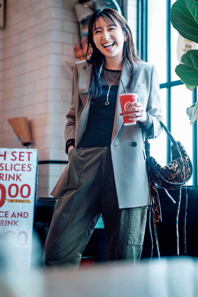 一枚だとちょっと難しい透けトップスは、ジャケットのメンズっぽさで引き算!