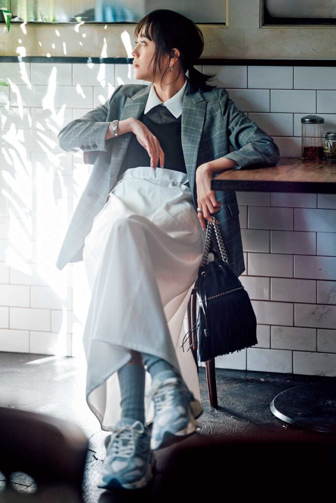 シャカシャカ素材のスカートやスニーカーで外しを効かせて、MIX感を楽しみたい。ジャケット¥20,900(グリーンレーベル リラクシング/ユナイテッドアローズ グリーンレーベル リラクシ ング ルミネ有楽町店)ニット¥26,400(エストネーション/エストネーショングランフロント大阪店)スカート¥33,000(ユナイテッドアローズ/ユナイテッドアローズ 丸の内店)バッグ¥ 165,000(J&M デヴィッドソン/J&M デヴィッドソン カスタマーセンター)スニーカー¥22,000(ニューバランス/ニューバランスジャパンお客様相談室)ソックス¥1,210(靴下屋/タビオ)イヤリング¥7,700(アビステ)バングル¥32,890リング¥10,010(ともにチビジュ エルズ/チビジュエルズ・ジャパン)