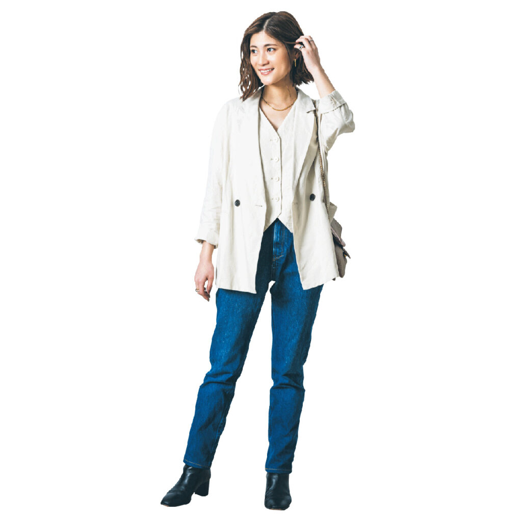 かぶりがちなデニム×ジャケットは淡めトーンで自分らしさを演出