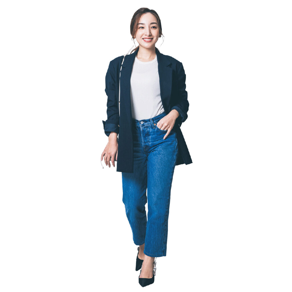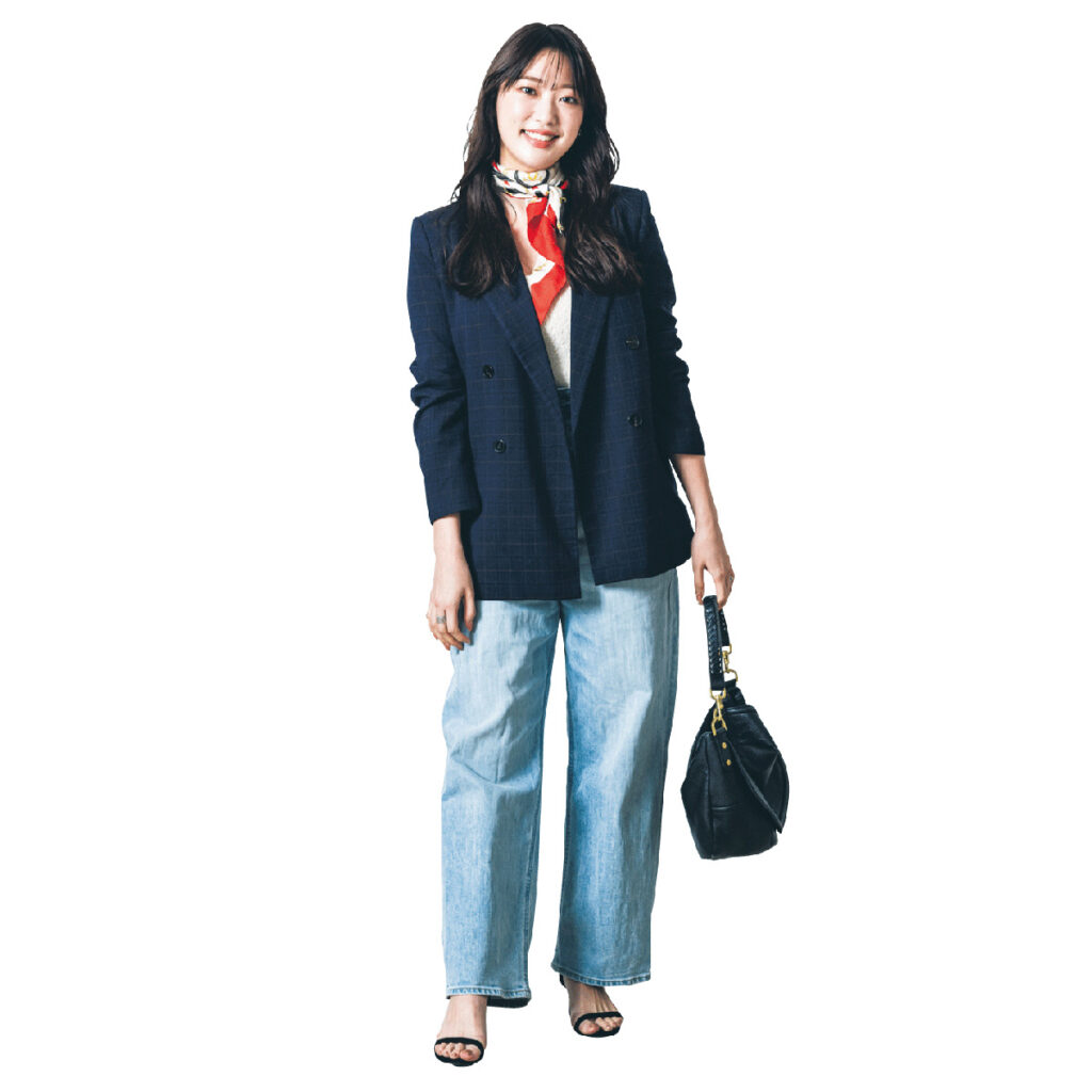 ジャケット×デニムのシンプルな組合せは社内でかぶることも多いので、お気に入りの柄スカーフを首に一巻きさせたりと、自分らしさをプラスしています。