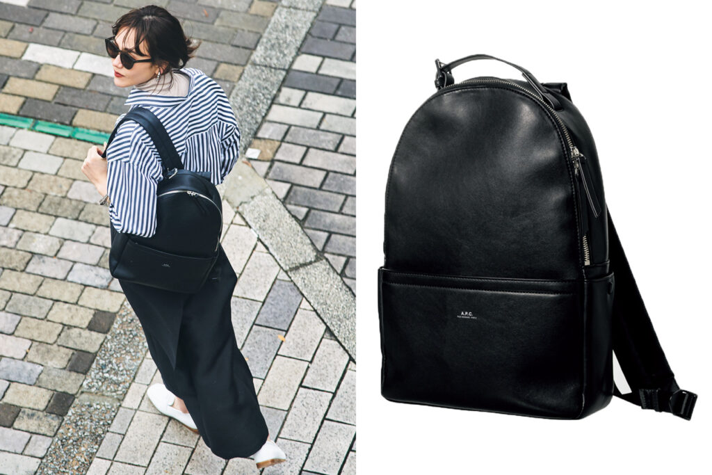 リサイクル原料を一部に使用したエコレザー素材。リュクスな印象に。バックパック〈H39×W27.5×D10cm〉¥66,000(アー・ペー・セー/アー・ペー・セーカスタマーサービス)