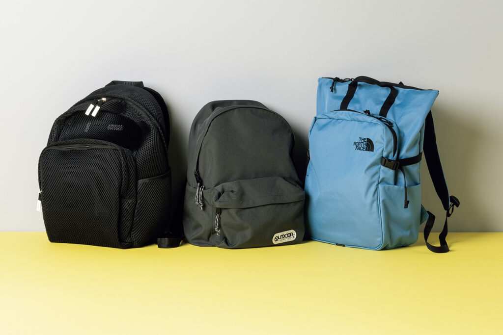 〈左から〉メッシュ素材。網目のサイズを変えることで中身が見えづらいのも嬉しい。バックパック〈H44×W35×D12㎝〉※別注¥18,700(ノマディス/RHC ロンハーマン)誕生以来愛され、軽くて丈夫で雨に強いナイロンリュック。〈H38×W32.5×D12.5㎝〉¥6,380(アウトドアプロダクツ/アウトドアプロダクツカスタマーセンター)正面にパッド入りのガジェットスリーブ。2wayバックパック〈H45×W35×D14.5㎝〉¥16,500(ザ・ノース・フェイス/ゴールドウイン カスタマーサービスセンター)