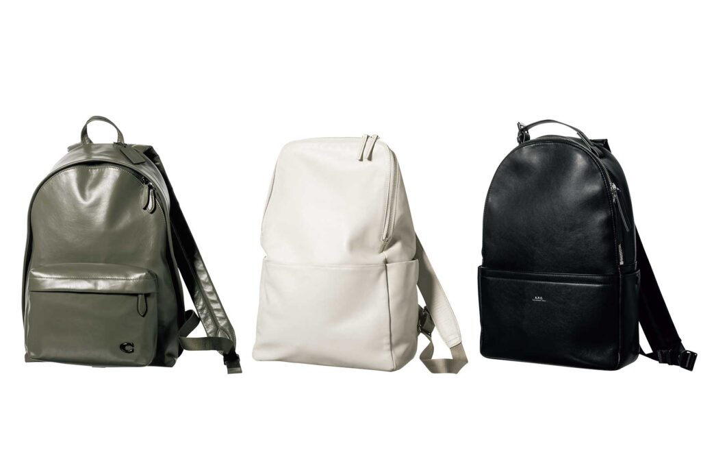 〈左から〉クールな出立ちでも15インチまでのPCを収納できるという頼もしさ。バックパック〈H42×W29×D10.5㎝〉¥99,000(コーチ/コーチ・カスタマーサービス・ジャパン)背面にポケットが付いていて、携帯電話やICカードも収納できます。バックパック〈H41×W27×D12㎝〉¥24,200(ガリャルダガランテ/ガリャルダガランテ青山店)リサイクル原料を一部に使用したエコレザー素材。リュクスな印象に。バックパック〈H39×W27.5×D10㎝〉¥66,000(アー・ペー・セー/アー・ペー・セー カスタマーサービス)