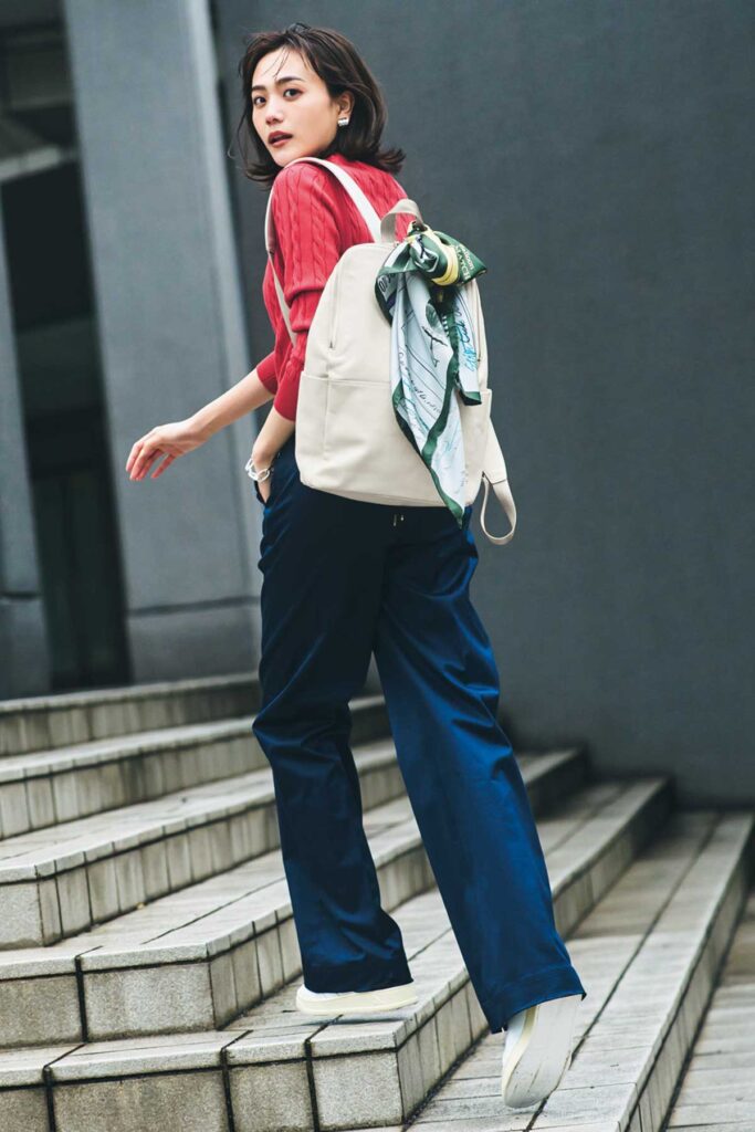 ミニマルなルックスながら、PCもしっかり入ります。アクセントにスカーフを巻いて、ワンツーコーデにアクセントを加えて。ニット¥19,800パンツ¥31,900(ともにブルックス ブラザーズ/ブルックス ブラザーズ ジャパン)スニーカー¥31,900(オートリー/デミルクス ビームス 新宿)スカーフ¥19,800(マニプリ)イヤリング¥165,000〈ウノアエレ〉ブレスレット¥12,100〈ワンエーアールバイウノアエレ〉(ともにウノアエレ ジャパン)バックパック〈H41×W27×D12㎝〉¥24,200(ガリャルダガランテ/ガリャルダガランテ 青山店)