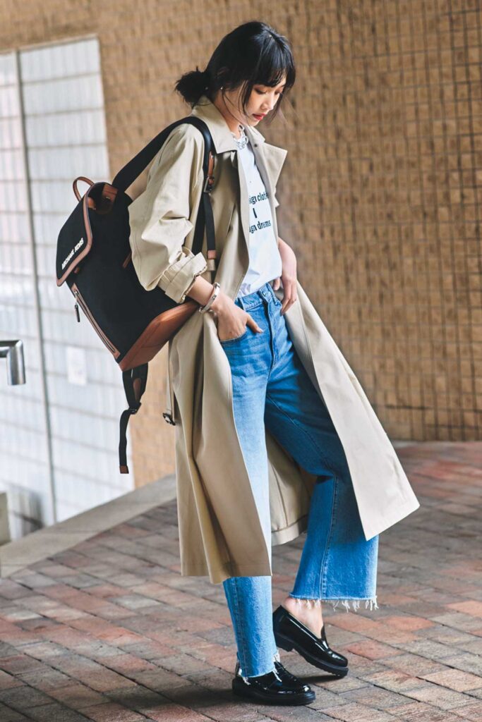 ベーシックな装いにハマる存在感のあるデザイン。Tシャツ¥7,700(アメリカンドリームズ/RHC ロンハーマン)トレンチコート¥89,650(ギャルリー・ヴィー/ギャルリー・ヴィー丸の内店)デニムパンツ¥42,900(マザー/サザビーリーグ)ローファー¥41,800(ユナイテッドアローズ/ユナイテッドアローズ渋谷スクランブルスクエア店)イヤリング¥135,300〈ウノアエレ〉ネックレス¥23,100バングル¥28,600〈ともにワンエーアールバイウノアエレ〉(すべてウノアエレジャパン)キャンバス地にレザーのパイピングがアクセントに。バックパック〈H41×W29×D10.5㎝〉¥80,300(マイケル・コース メンズ/マイケル・コース カスタマーサービス)
