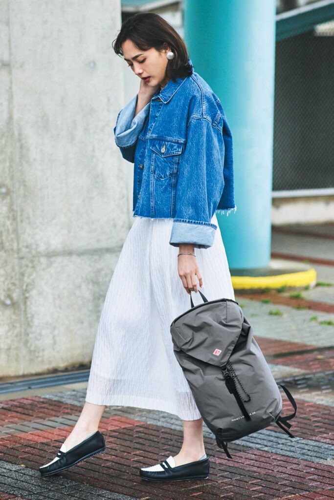 赤いロゴがGジャン×スカートの甘カジュアルのアクセントに。Gジャン¥46,200(サクラ/インターリブ)スカート¥25,300(ユナイテッドアローズ/ユナイテッドアローズ丸の内店)モカシン¥17,600(ミネトンカ/ミネトンカカスタマーセンター)イヤリング¥53,900〈ハルポ〉バングル¥26,400〈ロンハーマンジュエリー〉(ともにロンハーマン)通勤にはもちろん、アウトドアでも活躍する容量20L。撥水加工がされているのも頼もしい。バックパック〈H56×W21×D12㎝〉¥14,850(ダントン/ダントントウキョウ)