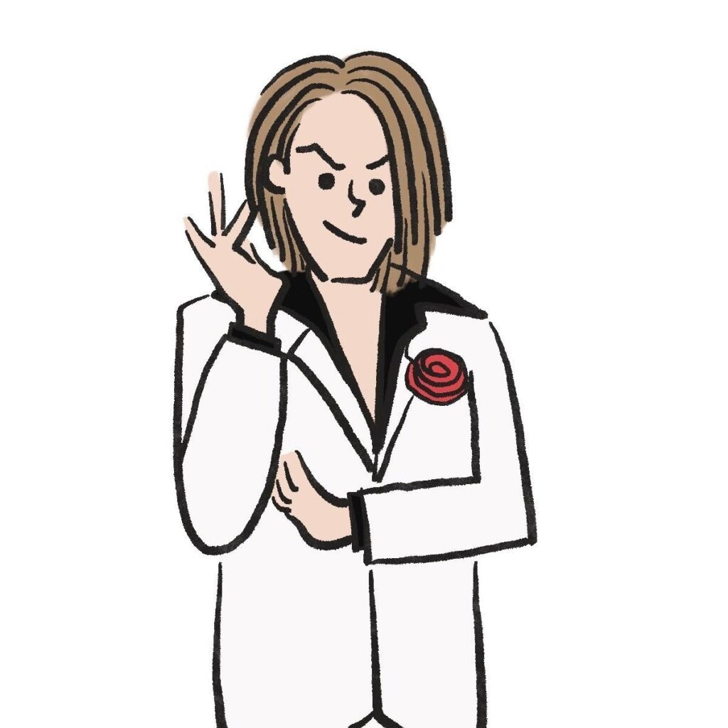 デビューは2003年。上下白のセットアップ、胸元に真っ赤なバラを差したスタイリングが定番。「僕、イケメン!」のフレーズで人気を集め、お笑いやバラエティ番組で大活躍。YouTube「狩野英孝 公式チャンネル EIKO!GO!!」でのゲーム実況にもファン多数。