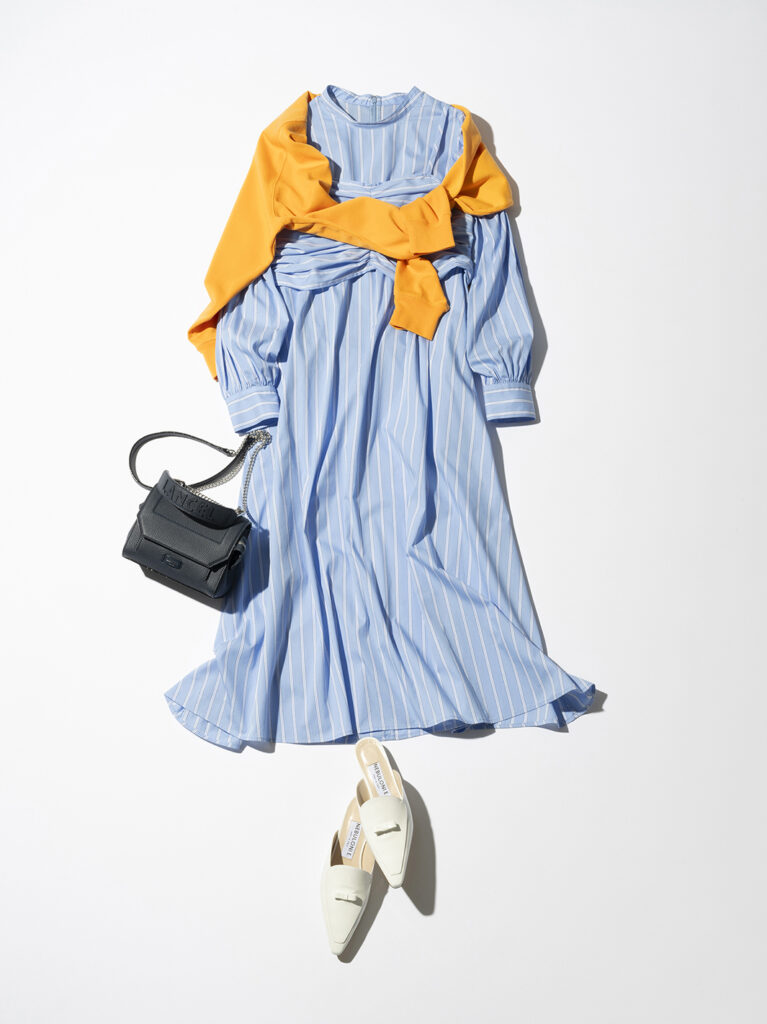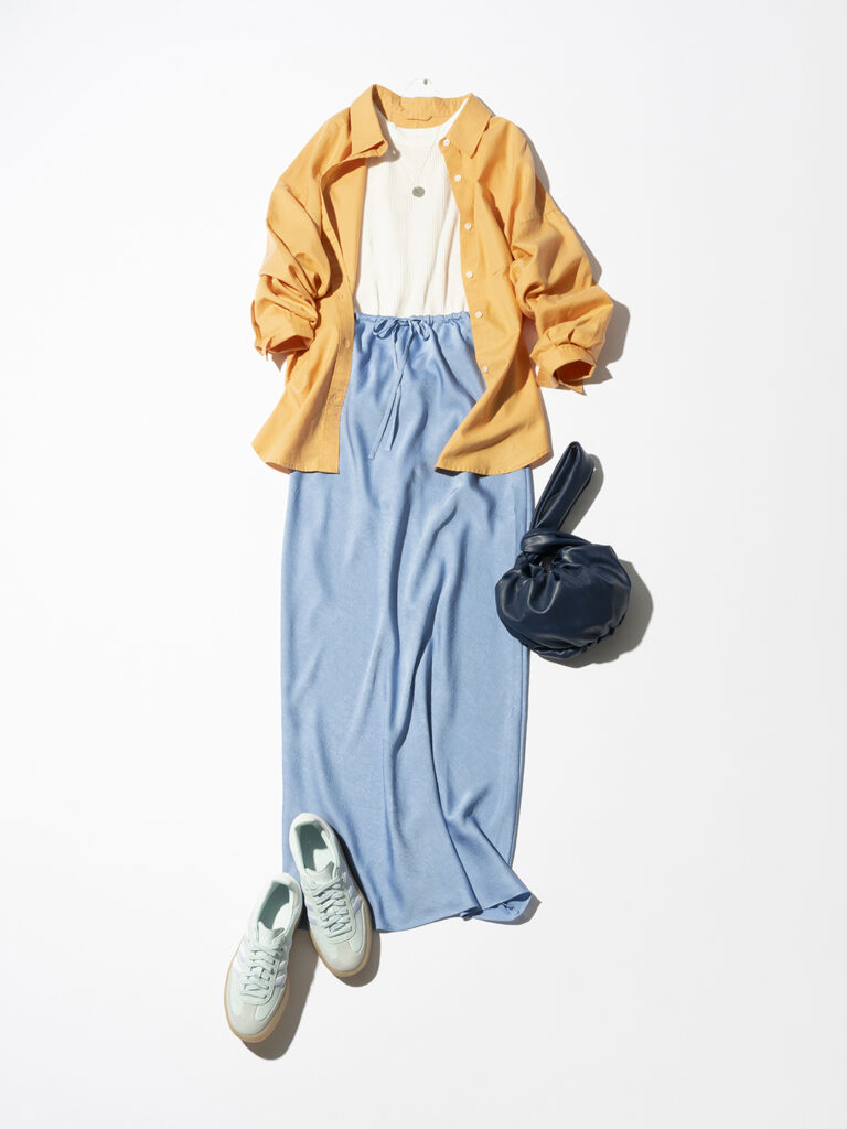 スカイブルー&オレンジで作る、春の好印象コーデ