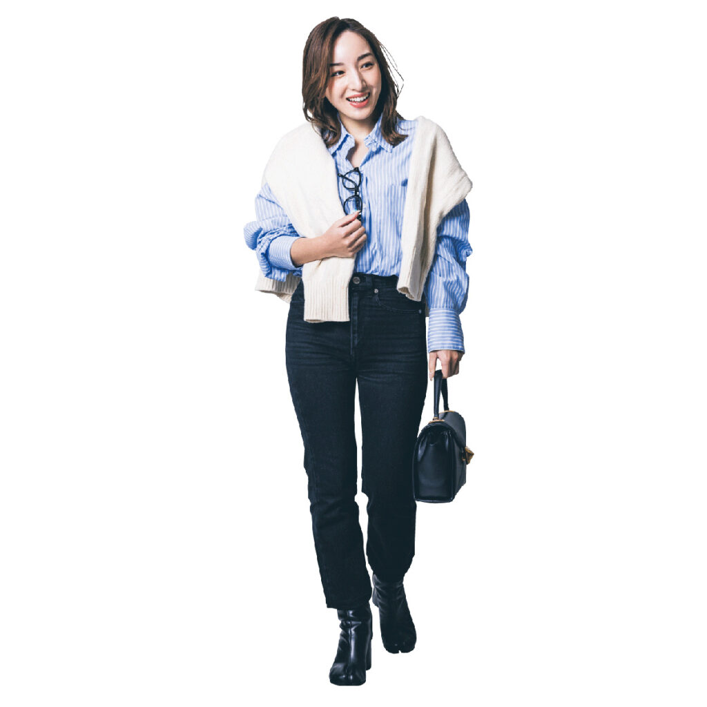 暖かくなると、シャツ×デニムをオール白でまとめることも多々。全体がぼんやりしないように、少量の黒を差したり、色ニットを肩掛けするのはマストです。