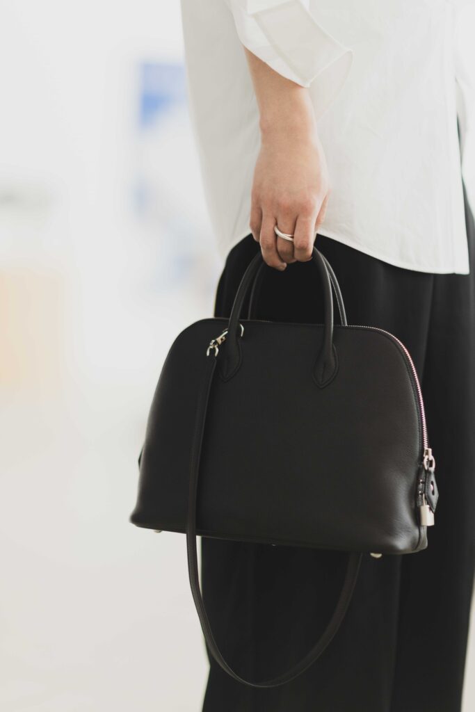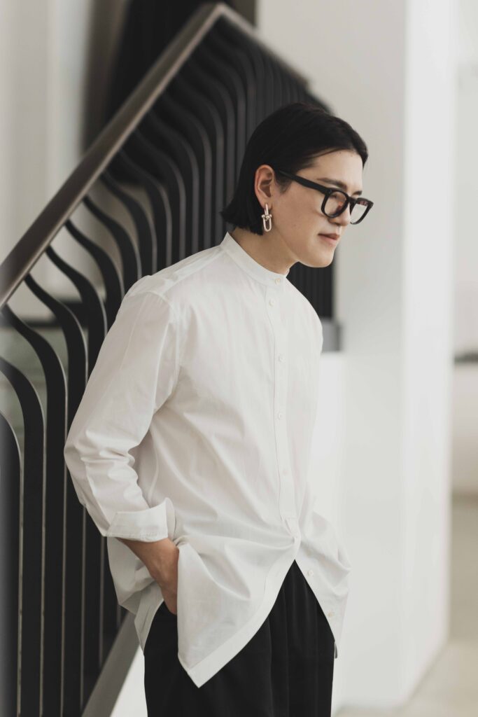「白シャツ×黒パンツという、スタンダードな組合せを会食仕様に。食事の席では上半身がポイントになるため、きちんと感を備えた白シャツとピアスで存在感を出しました。1年に数回、とっておきの日に着るのがJil Sanderのシャツ。シャツがパリッとしている分、パンツはしなやかなシルク素材、足元もフラットシューズを選びました。上下ともに力が入りすぎないように、全体のバランスや着心地のよさを意識しています」