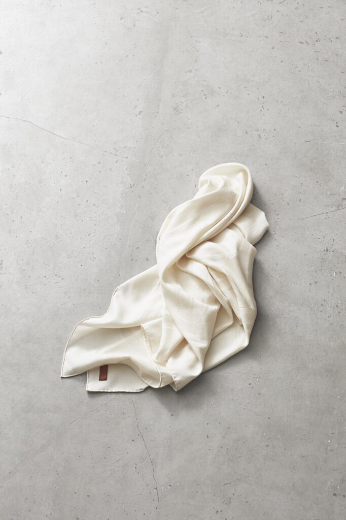 モノトーンが落ち着くという性格もあり、スカーフは黒・白・ネイビーなどのベーシックカラーを集めています。ベーシックカラーに絞ったセレクト、そして自然体な合わせ方が好きです。スカーフは真夏を除いて、ほぼ毎日着用しています。特別感のあるスカーフも、日常の延長線上にあるスタイリングで取り入れるのが、自分らしいなと感じます。