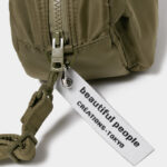 登場するカバンは、ビューティフルピープルのブランドカラーである生成色のエクリュ、柔らかな印象のオリーブ、深みのあるチャコールグレーとニュアンスのあるカラーに加え、素材は耐久性に優れたナイロンツイルと中綿ボンディング、さらに前面の2つのポケットと内部に収納ポケット付きで機能性にも優れたデザインです。