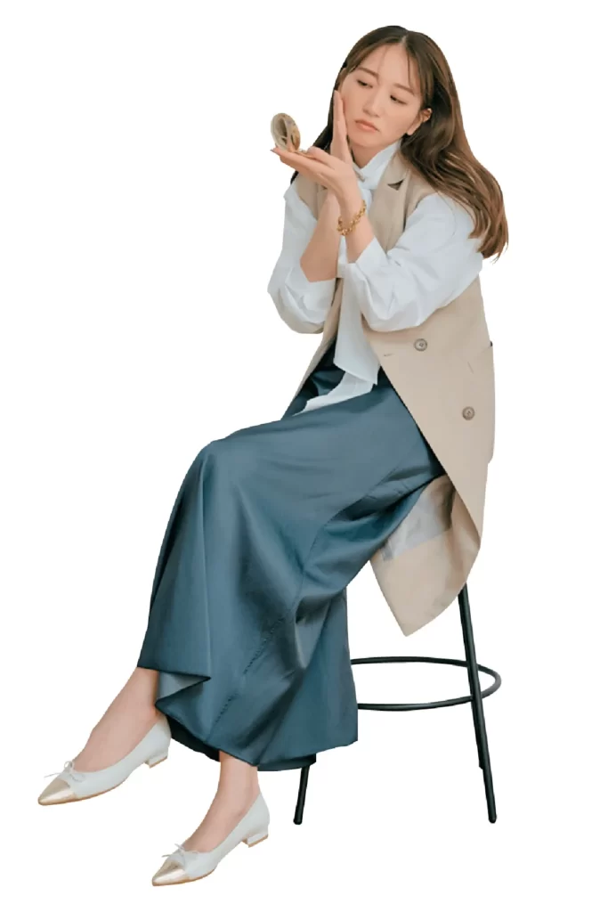 華やかな印象のサテンスカートも、落ち着いたくすみブルーをチョイスすることでオフィスシーンにも対応可能。ボウタイブラウス×ジレのレイヤードスタイルが今っぽさを醸し出します。足元は、軽やかなパステルカラーのパンプスで春っぽくまとめて。