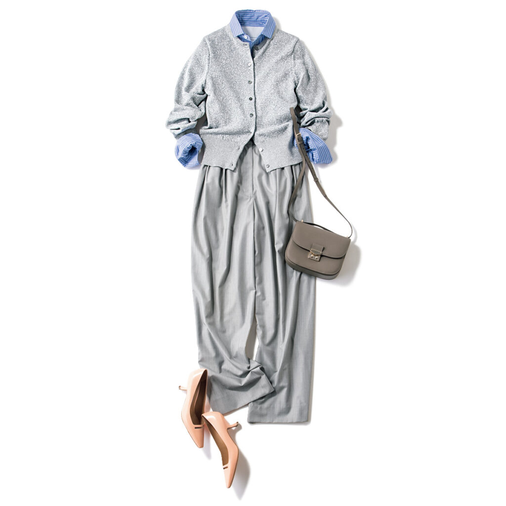 オーバーサイズシャツ着回し ラメカーデ¥25,300(ウィム ガゼット/ウィム ガゼット ルミネ新宿店)グレーワイドパンツ¥29,700(バッカ/ビー エディション ニュウマン新宿店)バッグ¥209,000(ボナベンチュラ)パンプス¥68,200(ペリーコ/アマン)