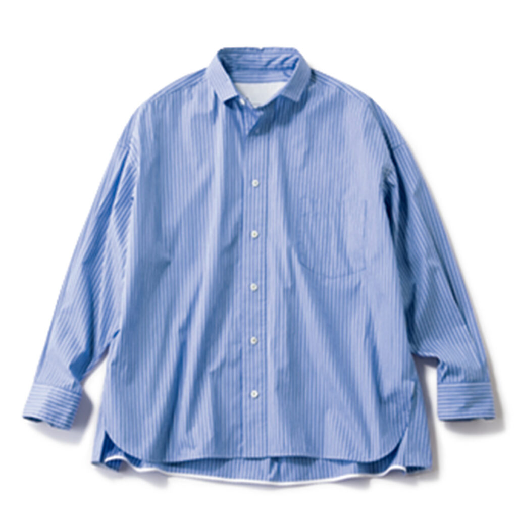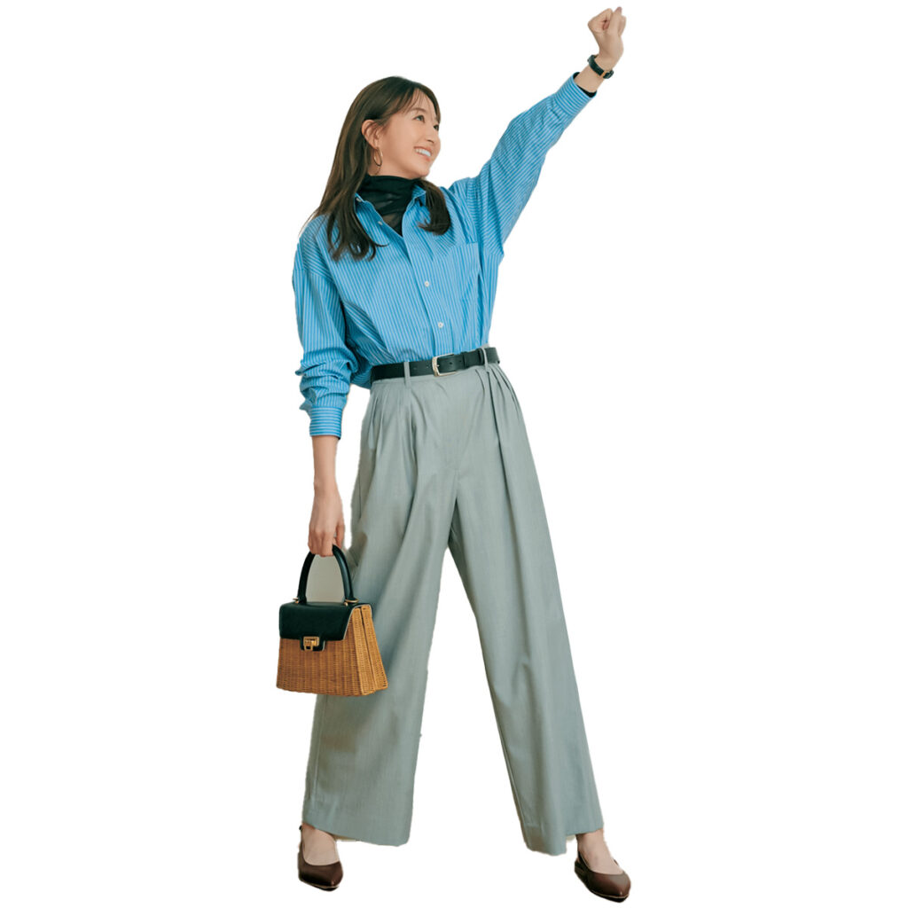 きちんと感と清潔感を印象づける、ブルー×白のストライプ柄。メンズライクなオーバーサイズを選ぶのが今っぽさの秘訣。シャツ¥26,400(ティッカ)
