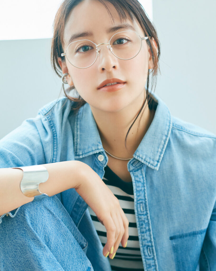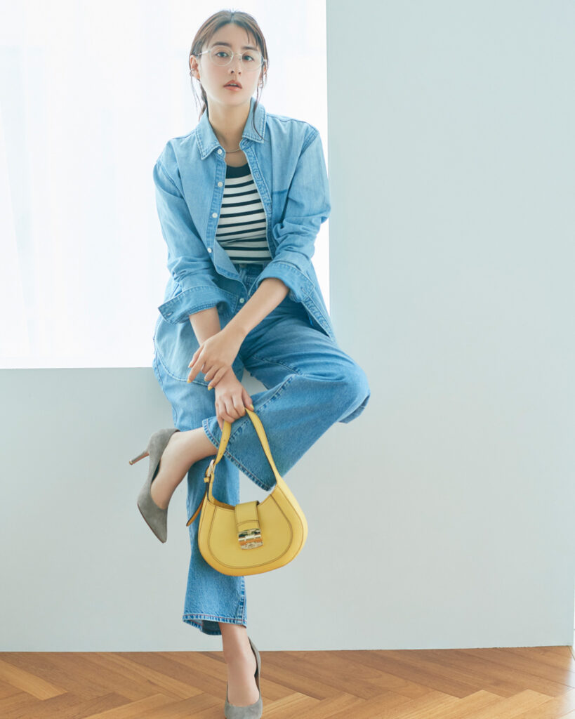 着慣れたデニムコーデのアップデートにアイウェアが貢献。かといって主張しすぎず、ちゃんと日常に溶け込むところが頼もしい。メガネ[VFU797J]¥23,100(フルラ アイウェア/デリーゴジャパン)シャツ¥24,200〈レッドカード トーキョー/ゲストリスト〉デニムパンツ¥16,500〈ニードバイヘリテージ〉(ともにゲストリスト)タンクトップ¥2,990(Gap)バッグ¥64,900(フルラ/フルラ ジャパン)パンプス¥30,800(銀座かねまつ/銀座かねまつ6丁目本店)イヤーカフ[3個セット]¥8,800(アビステ)ネックレス¥11,000バングル¥11,000(ともにイン ムード/フォーティーン ショールーム)