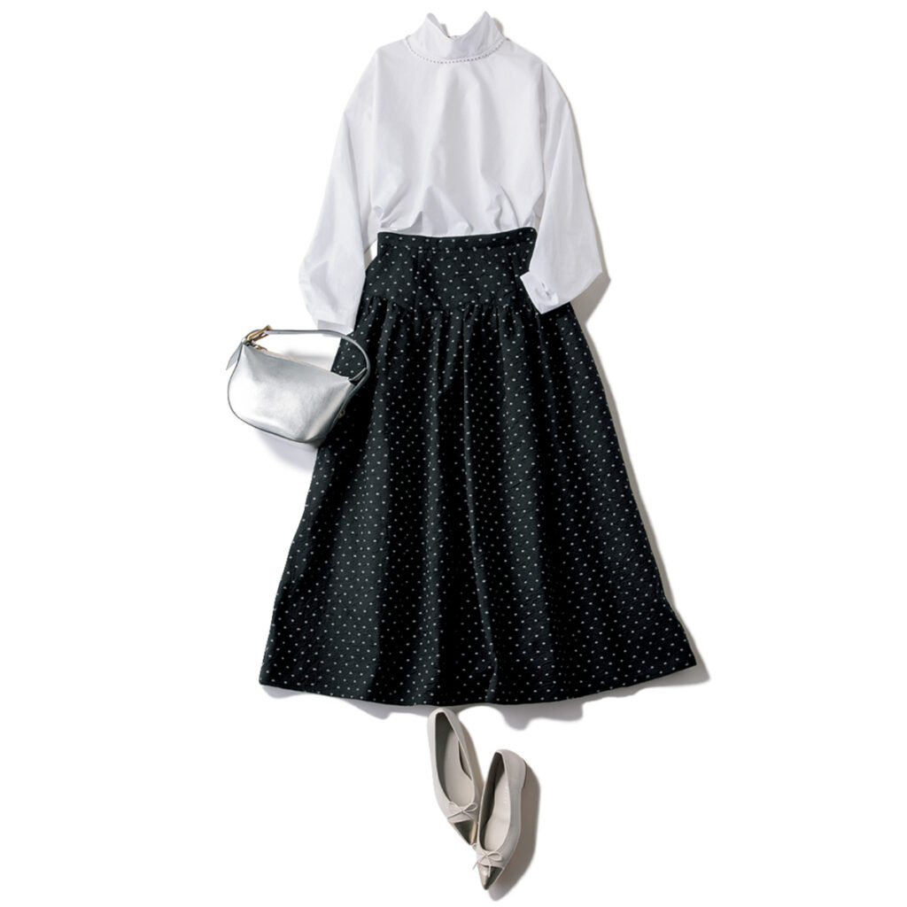 構築的フレアスカート着回し ボウタイブラウス¥18,700(ユナイテッドアローズ/ユナイテッドアローズ 丸の内店)バッグ¥154,000(J&M デヴィッドソン/J&M デヴィッドソン カスタマーセンター)パンプス¥11,550(ル タロン/ル タロン 有楽町マルイ店)ネックレス¥20,900(ココシュニック オンキッチュ/ココシュニック)