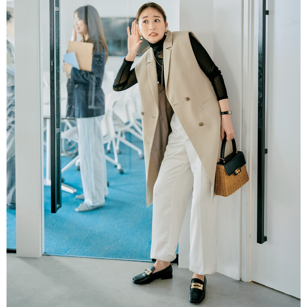 パラシュートパンツ着回し シアートップス¥13,200(ソブ/フィルム)ロングジレ¥35,200(ルーニィ)バッグ¥94,600(カパフ/エッセンス オブ アナイ)ローファー¥79,200(ペリーコ/アマン)イヤリング¥8,800(アビステ)ネックレス¥73,700(ココシュニック)時計¥19,800(カンポ マルツィオ/クラスフォーティーン)