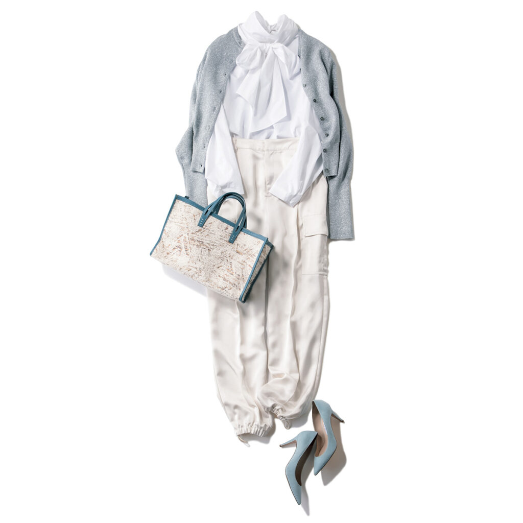 パラシュートパンツ着回し ボウタイブラウス¥18,700(ユナイテッドアローズ/ユナイテッドアローズ 丸の内店)ラメカーデ¥25,300(ウィム ガゼット/ウィム ガゼット ルミネ新宿店)バッグ¥58,300(ア ヴァケーション)パンプス¥57,200(ネブローニ)