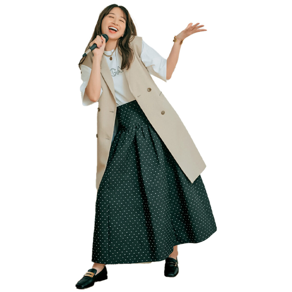 ロゴTに構築的なフレアスカートを合わせた甘めカジュアルコーデに、ベージュジレできちんと感をプラス。ジャケットライクなロング丈で、大人っぽくスマートな印象に。ローファーで品行方正なムードをひとさじ添えれば、オフィカジにもデートにもぴったりな装いに。