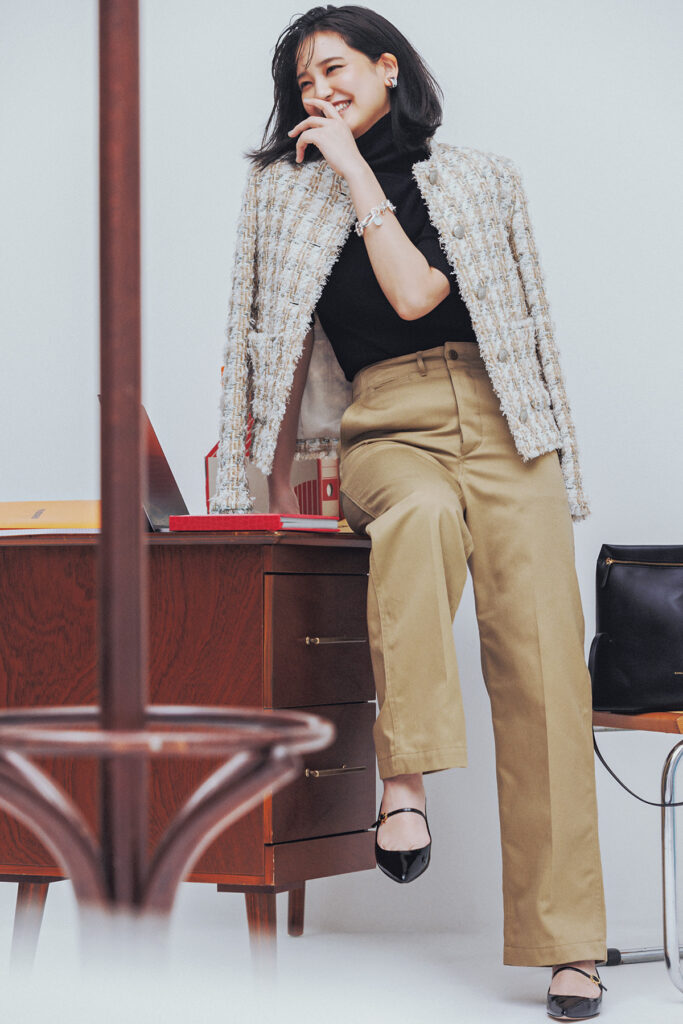働くCLASSY.世代にマストなベージュチノパンは、きれいめにもクリーンにも決まる太めストレートがおすすめです。ツイードジャケットを肩からサラッと羽織れば、“華やかだけど気取ってない”オフィスコーデに。パンプスではなく、メリージェーンで大人の可愛げを加えるのが今っぽく決まる秘訣。