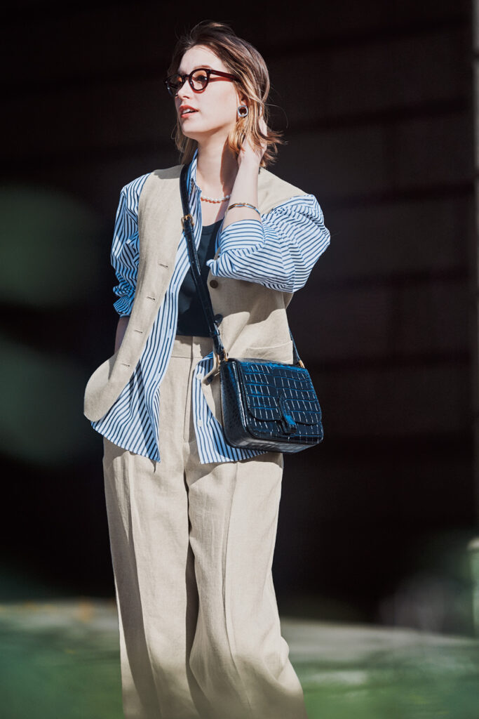 メンズライクなスタイリッシュさを演出する、ジレとパンツのセットアップ。淡いベージュがぼやけないよう、黒インナーやストライプシャツを合わせるのがポイントです。カッコいいけど抜け感のある、一歩差が付くオフィスコーデに。