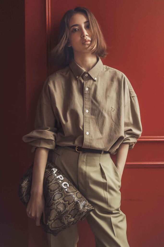 シャツ×パンツのお決まりコーデは、シルエットにこだわるだけで、グっと旬顔に更新されます。タックやバルーンシルエット、裾のボタンなどのアクセント入りベージュパンツで、無難に見えるのを防ぎます。短丈シャツもバルーンスリーブを選び、パンツとシルエットをリンクさせると統一感ある着こなしに。