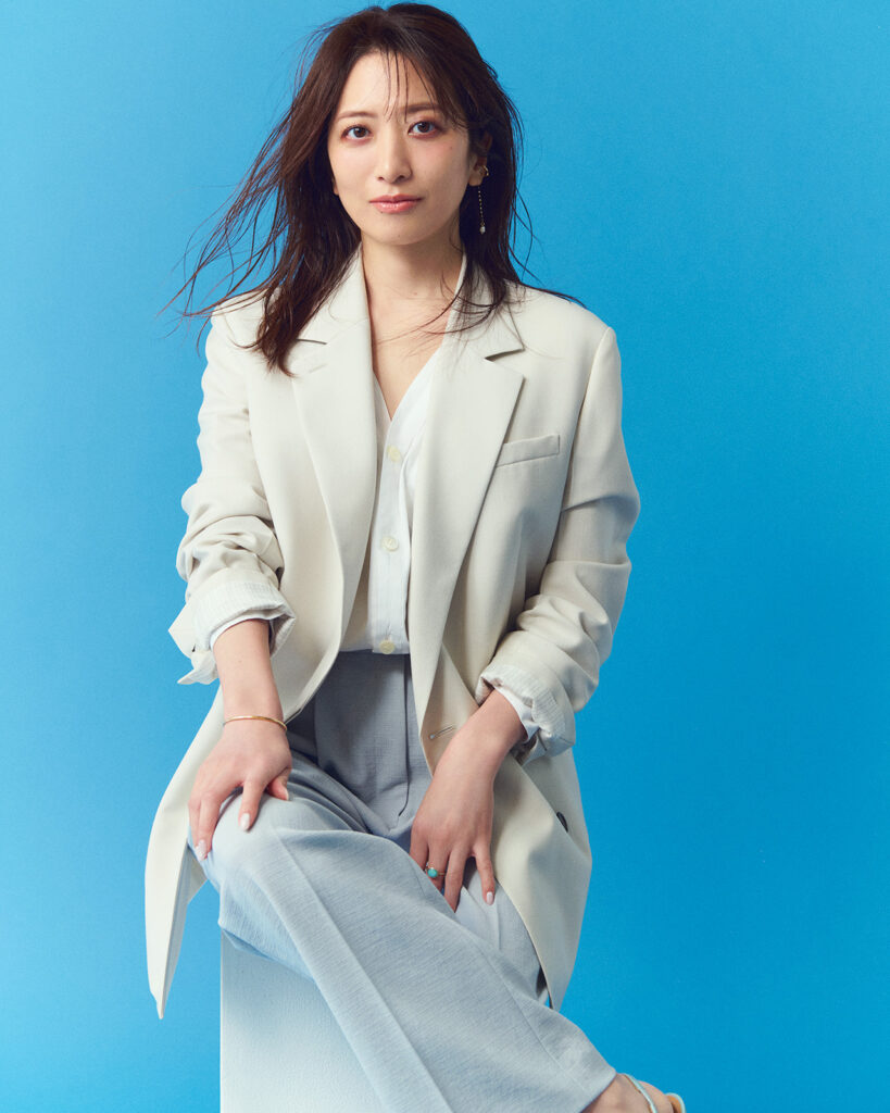 「ライトカラーのジャケットは初挑戦! また今季は、肩パッドが入ったメンズライクなジャケットも豊富なのだとか。ハンサムな雰囲気になって、いつもと違うイメージでジャケットを着ることができました」(笹崎さん)