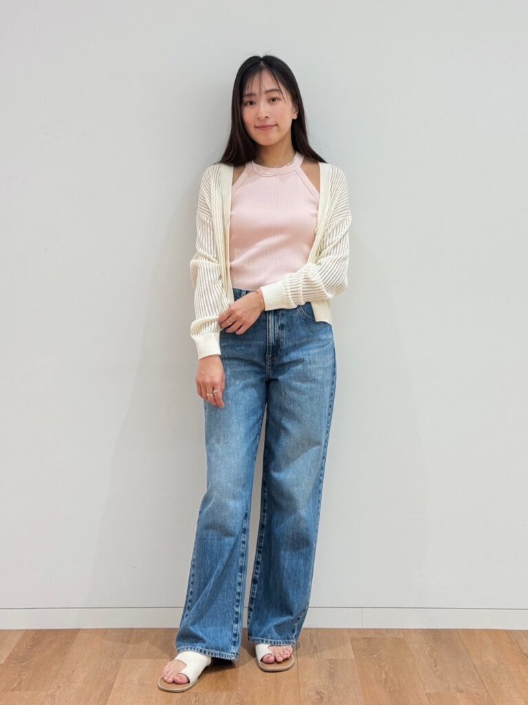 流行りのアメスリでデニムとのワンツーコーデもサマ見え!肩回りをすっきり見せてくれるホルターネックデザインが、大人のヘルシーカジュアルを完成させます。暑くてスタイリングが簡略化されがちな夏、大活躍すること間違いなしのアイテムです。ホルターネックブラタンクトップ¥2,290[Mサイズ着用]
