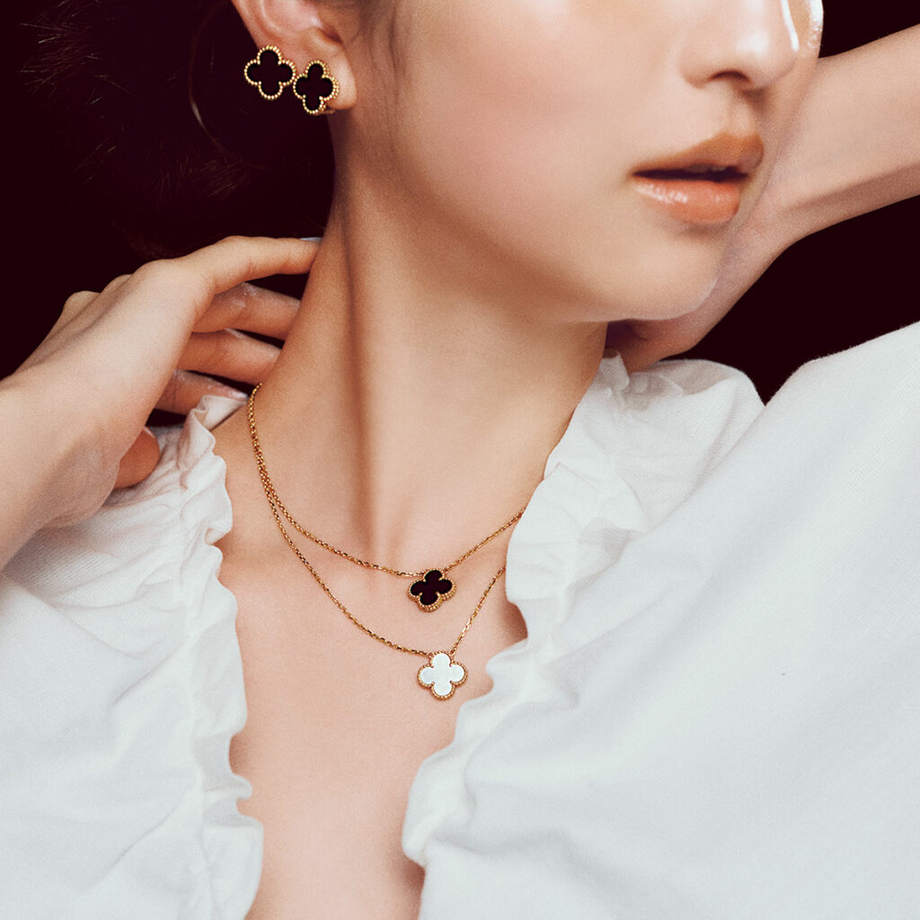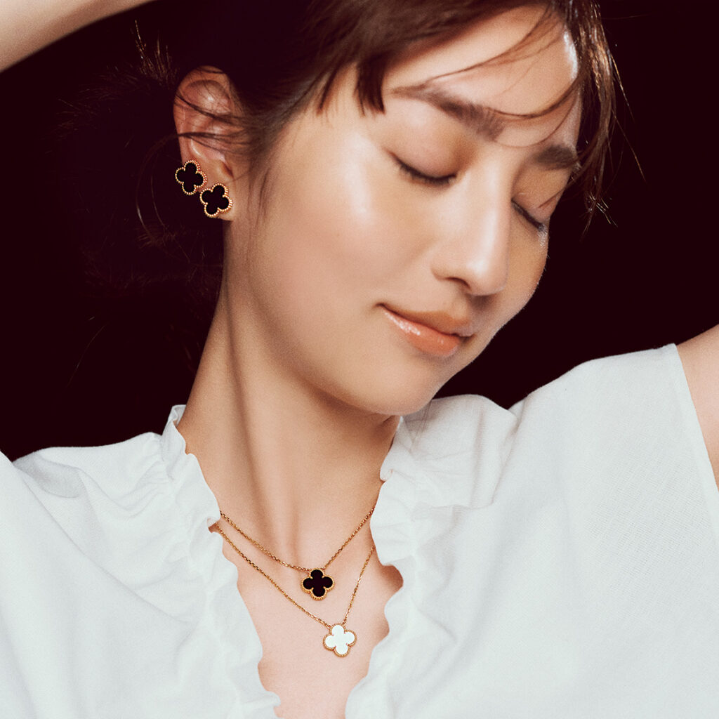 〝可愛い〟の一歩先の景色は、ヴィンテージアルハンブラとともに。「ヴィンテージ アルハンブラ」イヤリング〈YG×オニキス〉¥654,500ペンダント上〈YG×オニキス〉下〈YG×マザーオブパール〉各¥451,000(すべてヴァン クリーフ&アーペル/ヴァン クリーフ&アーペル ル デスク)ブラウス¥31,900(ネル/シップス インフォメーションセンター)