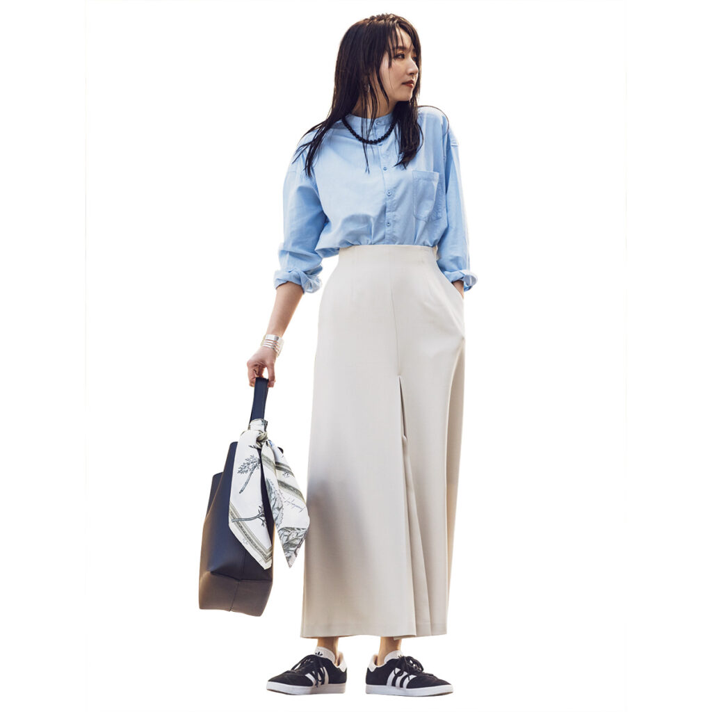 ごつすぎないフォルムでAラインスカートとも相性GOOD。ベーシックカラーはもちろん、キレイ色とも喧嘩しない色合いで活躍度大。アイコニックなスリーストライプスがともするとシンプルになりすぎてしまう平日コーデのアクセントになります。スニーカー「GAZELLE」¥15,400(アディダス オリジナルス/アディダスお客様窓口)シャツ¥26,400(ティッカ)スカート¥27,500(アルアバイル)バッグ¥84,000(フランツロアー/DES PRÉS)スカーフ¥19,800(マニプリ)ピアス¥7,700ネックレス¥7,140バングル¥7,830(すべてアビステ)