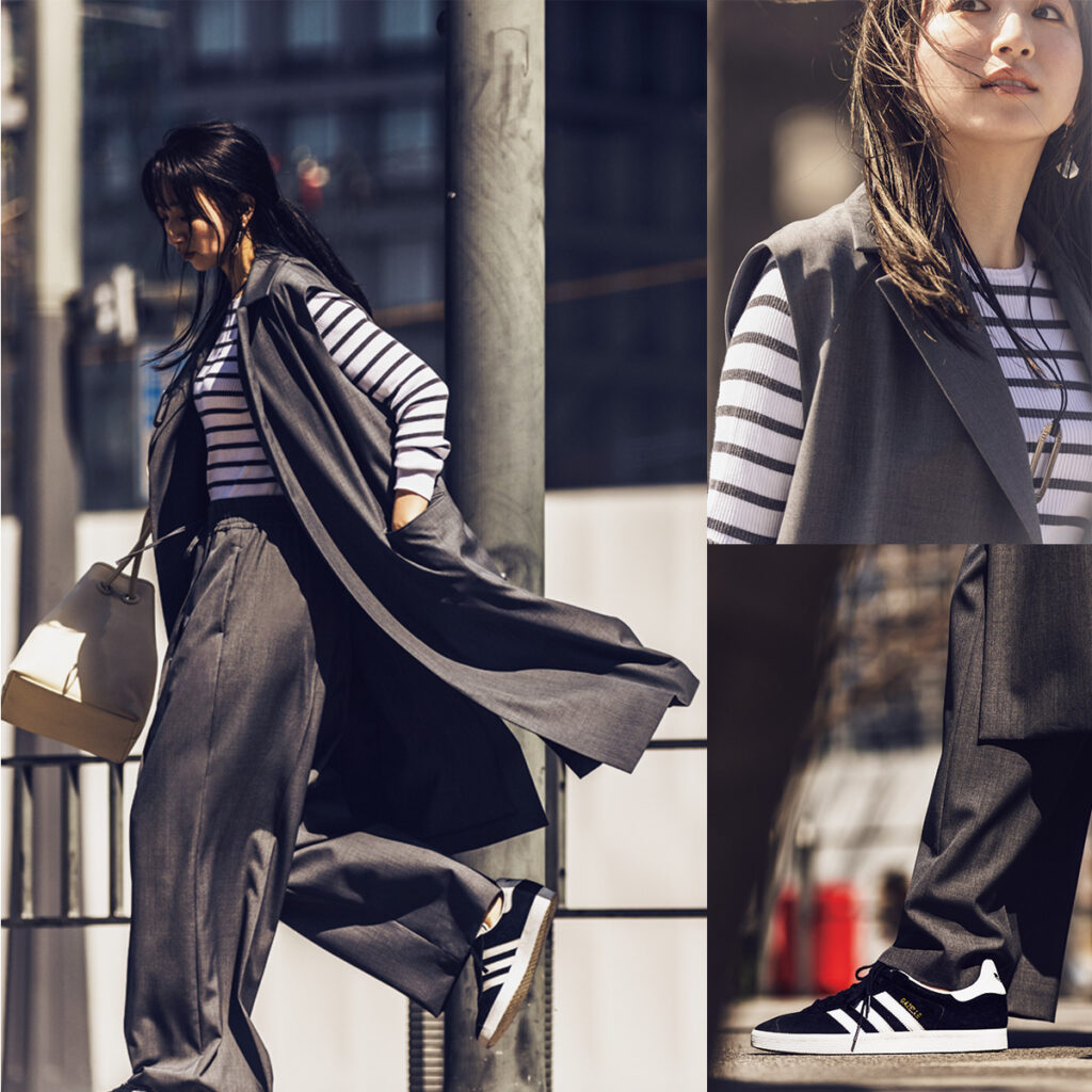 白黒配色とすっきりローテクでスニーカーでもキレイめキープ。ジレのセットアップと合わせてカッコよく。スニーカー「GAZELLE」¥15,400(アディダス オリジナルス/アディダスお客様窓口)ジレ¥119,900パンツ¥48,400(ともにマッキントッシュ/マッキントッシュ ギンザシックス店)ボーダーニット¥24,200(ギャルリー・ ヴィー/ギャルリー・ヴィー・丸の内店)バッグ¥52,800(ヴァジック/ヴァジック ジャパン)ピアス¥19,800ネックレス¥29,700(ともにアダワットトゥアレグ)